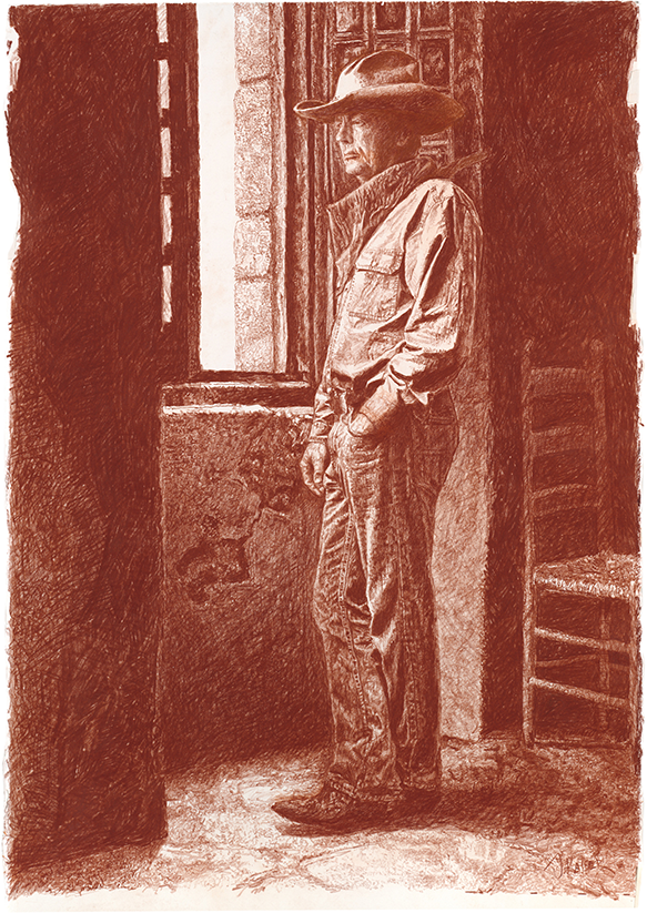“Wrangled” represents the pinnacle moment when cowboy, horse and steer face-off with one another. This is a celebration of draftsmanship. Using only one color, I am challenged to depict the many textures that make-up this composition: worn leather, horse hair, wool and the intangible atmosphere of dust and a stormy sky"Wrangled" 30”x 42” Colored Pencil