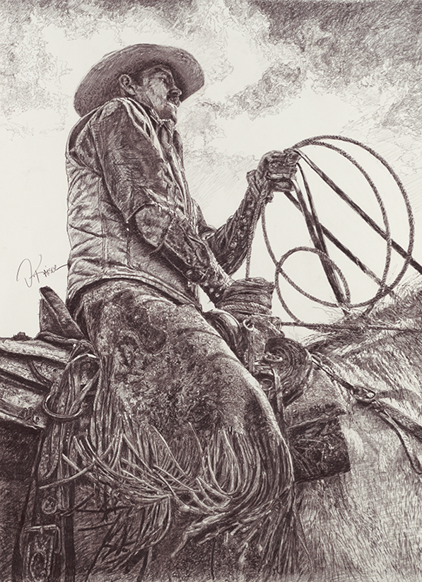 I have always been fascinated by the Buckaroo. They are the art and class of wrangling. Known for their mastery of horsemanship, flashy style and unique personal expression, the Buckaroo embraces life with purpose and commitment“Buckaroo” Size 36”x 24” Polychromes Pencil