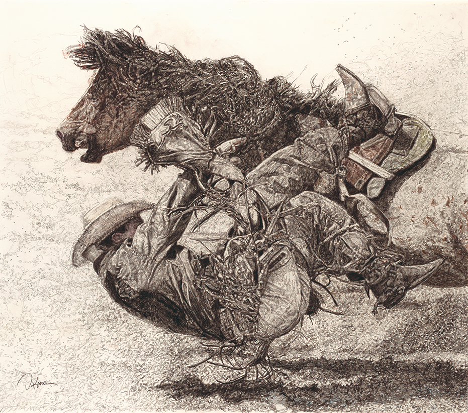 "When a Wrangler and a Bronc meet their match, they are both going’ down hard!“ This explosive image is a celebration of Draftsmanship. Capturing all the detail of the movement was challenging yet very exciting."Slammed" 29" x 25" Polychromos Pencils